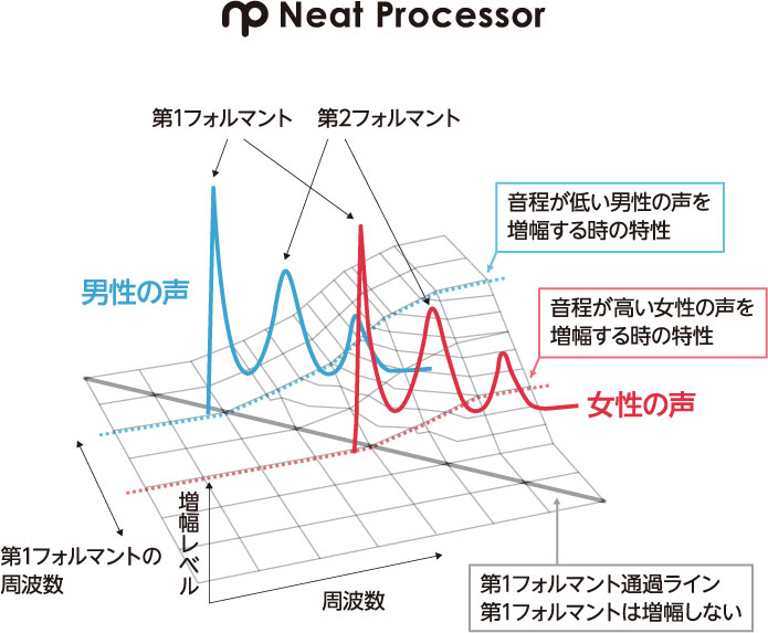 従来は音声を明瞭にする方法として、音声の高調波成分(第2フォルマント以降)が分布する1kHzから上の周波数を増幅した。しかし、このように増幅特性が固定されていると、周波数(音程)が高い女性や子供の声の場合に、主成分(第1フォルマント)が増幅されるのでキンキンした音(声)になってしまう。 そこで、当音声明瞭化回路ニートプロセッサ(Neat Processor)では、声の周波数(音程)に応じて増幅特性を変更し、男性のように低い音程でもこもらず明瞭になりながらも、女性や子供のように高い音程でもキンキンしない、自然なままに明瞭に聞こえる効果を実現した。 [用語解説]フォルマント:音声を周波数分析すると、幾つかのピークが見える。このピークをフォルマントと呼び、周波数が低い方から順番に第1フォルマント、第2フォルマント…と呼ぶ。 高調波成分:ある周波数成分(主成分)に対して高次の周波数成分を高調波成分と呼び、この高調波成分の分布の仕方によって音色が表現される。多くの場合に主成分が最も信号レベルが高く、高調波成分は周波数が高くなるほど信号レベルが低くなる。